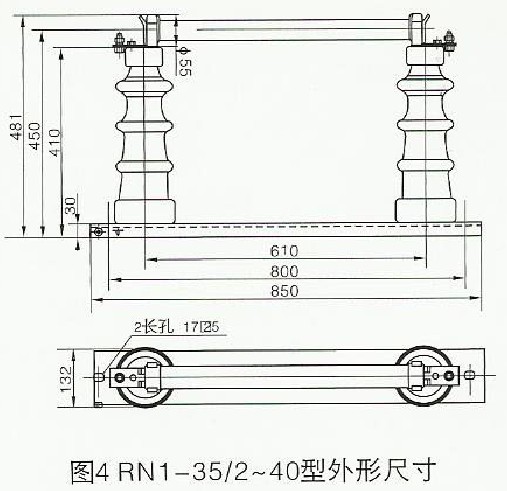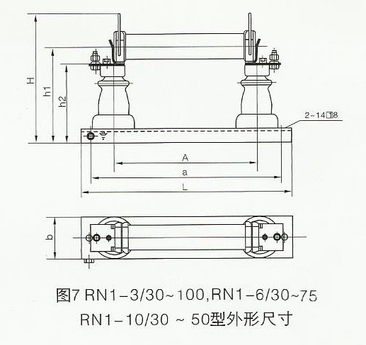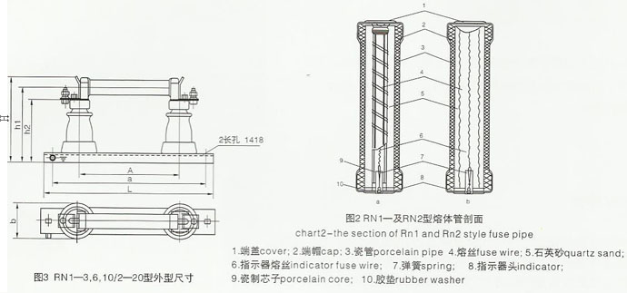 RN1,RN3型熔断器是由两个支柱绝缘子,触座,及熔丝管,座板等四部分组成。支柱绝缘子安装在座板上,触座固定在支柱绝缘子上,熔丝管则放在触座中固定,但两端的铜帽绕装在瓷管上,熔断管管内熔丝按额定电流的大小,用一根或多根熔丝绕到有棱的芯子上(额定电流小于7.5A的)或绕城螺旋形直接安装在管内(额定电流大于7.5安的)然后充填石英砂,两端铜帽用端盖压紧,用锡合牢,以保持密封。